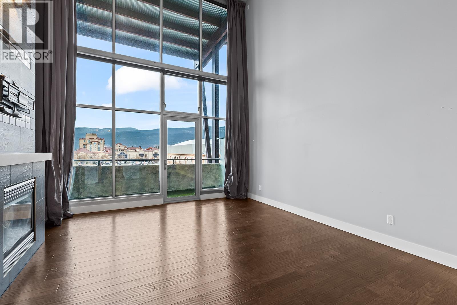 Rare opportunity in the highly sought-after Cannery Lofts, located in the heart of downtown Kelowna. This top-floor, lake-facing unit offers an exceptional blend of style, comfort, and convenience. Featuring 20-foot ceilings and a contemporary loft design, the home includes one bedroom, two bathrooms, and a spacious flex room that can serve as a second bedroom, office, or den. The open-concept living area is bright and airy, with floor-to-ceiling windows, a gas fireplace, and access to a covered patio with lake views. The kitchen is equipped with upgraded appliances, including a gas range. Additional highlights include in-suite laundry, hardwood flooring, newer carpet and window coverings, and fresh paint throughout. The secure concrete building offers one indoor parking stall, bicycle storage, a shared rooftop patio, and excellent security features. Pet permitted with approval. An exceptional downtown lifestyle steps from restaurants, cultural amenities, and the business district. (id:17834)